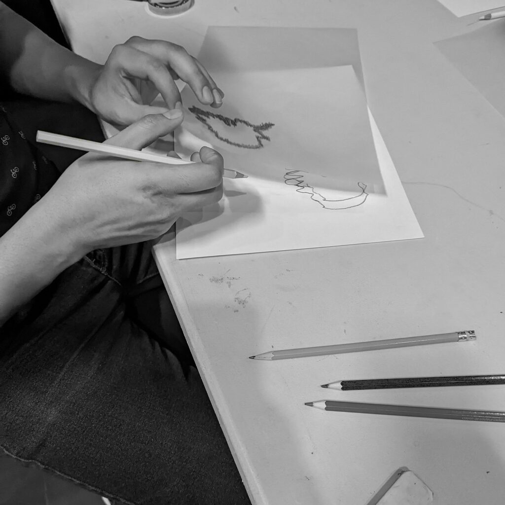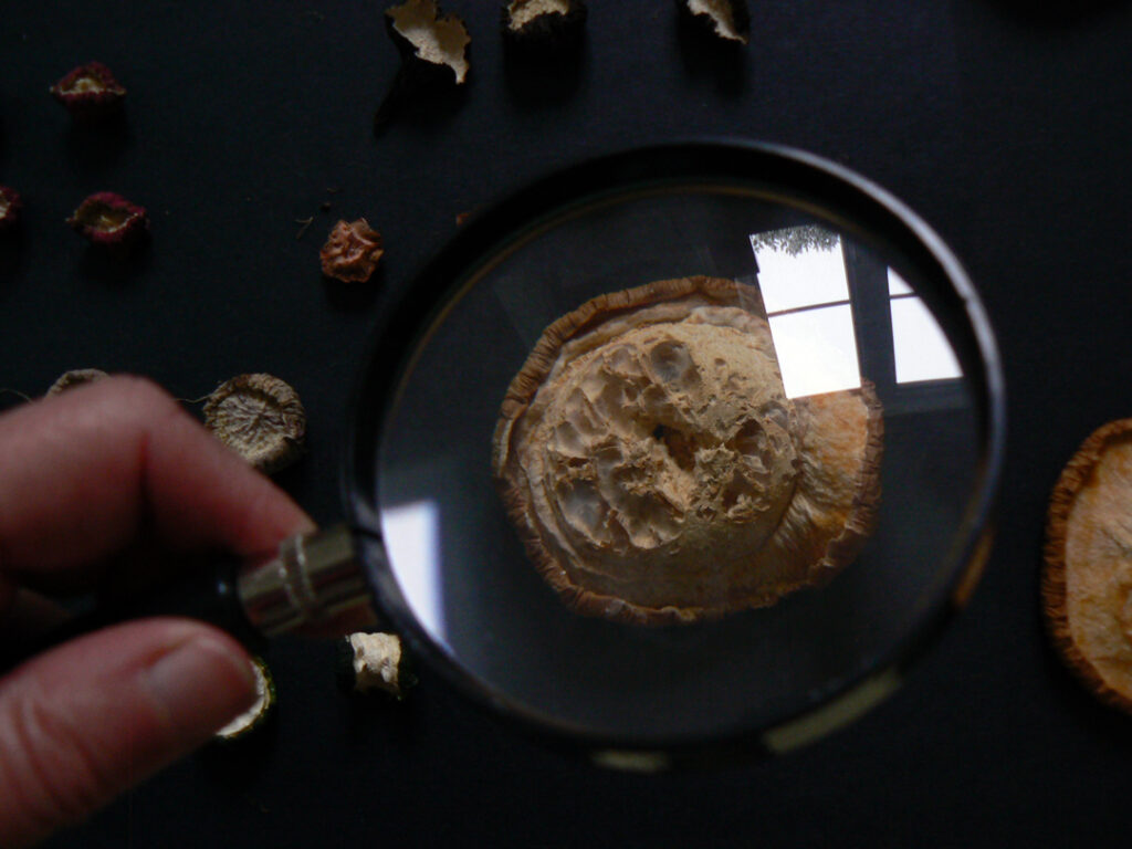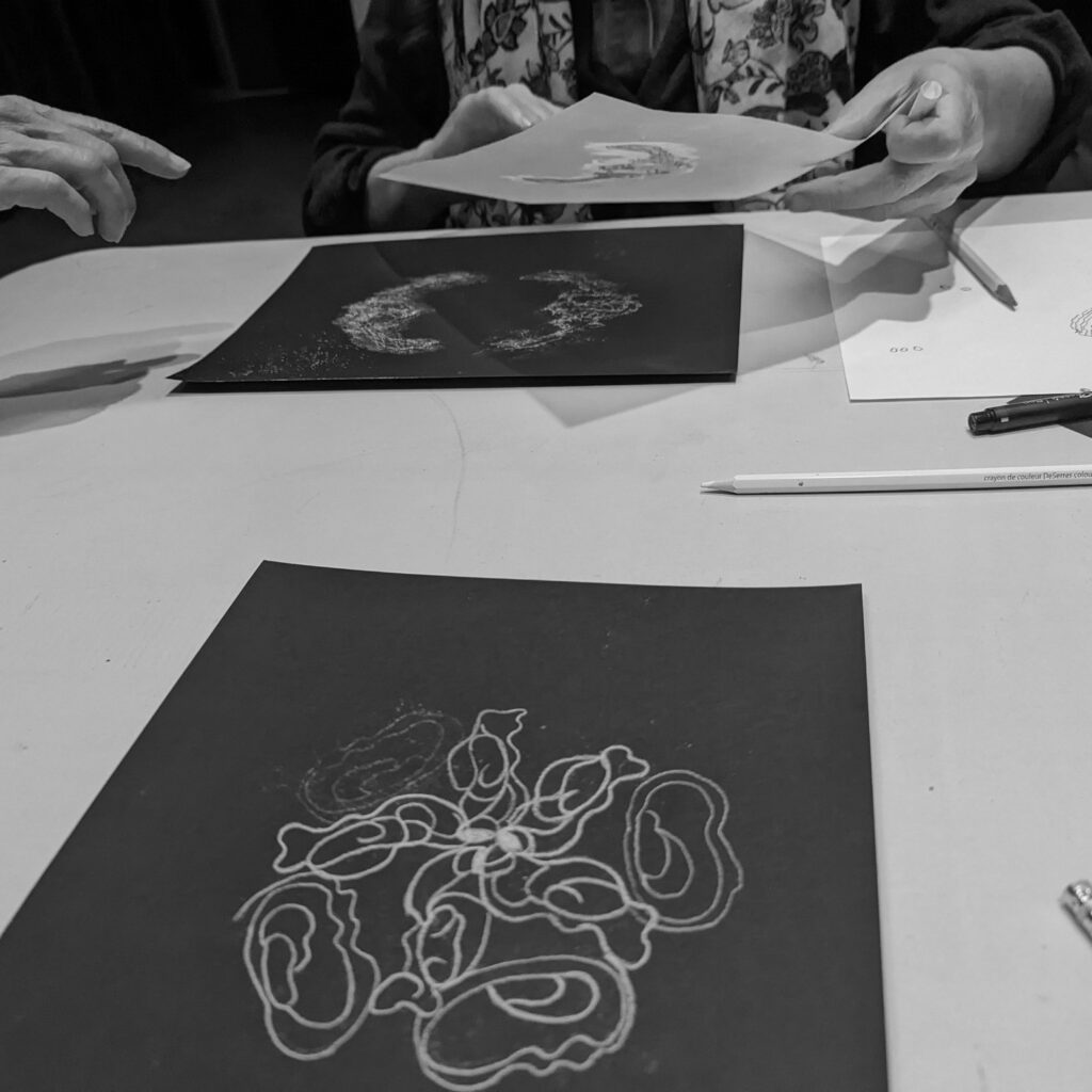 Cet atelier est basé sur l’observation de tranches de légumes séchées, réalisée en synchronisant le parcours du regard et de la main, pour ensuite doubler avec le papier calques les lignes obtenues afin qu’émerge une nouvelle complexité.