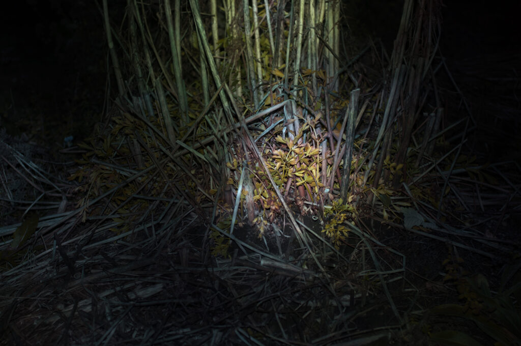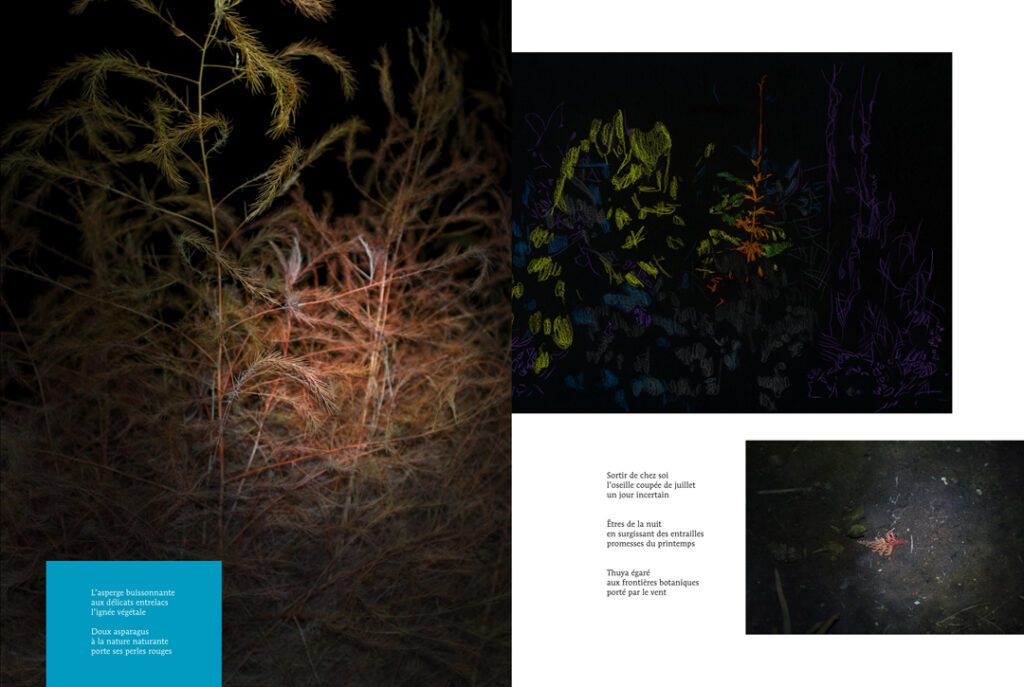 My vegetable garden is the source of nocturnal photographic sessions on which I have used a translucent tinted tracing to foreground the space she is interested in. This new approach, which is at the heart of her micro-publishing residency, is accompanied by haikus and colored pencil drawings.