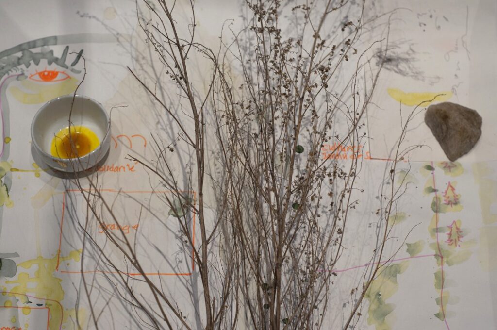 Avec les élèves inscrits au centre 216, je poursuis des explorations artistiques évolutives basées sur l’observation et l’expression du domaine végétal. Les productions sont mises en relation avec une double carte hydrographique de la région du Saguenay, située au centre de l’atelier qui m’est attribué, afin d’imaginer un nouveau rapport sensible au territoire. Aussi, une partie du processus s’inspire de la classe d’horticulture. Par ailleurs, dans le prolongement de la participation annuelle de l’école aux travaux des fermes Solidar, des élèves réalisent sur place des dessins d’observation sur le terrain et un dessin collectif d’une carte du site. Cet ensemble d’œuvres servira de base à une exposition présentée dans le kiosque de Solidar, puis en galerie.